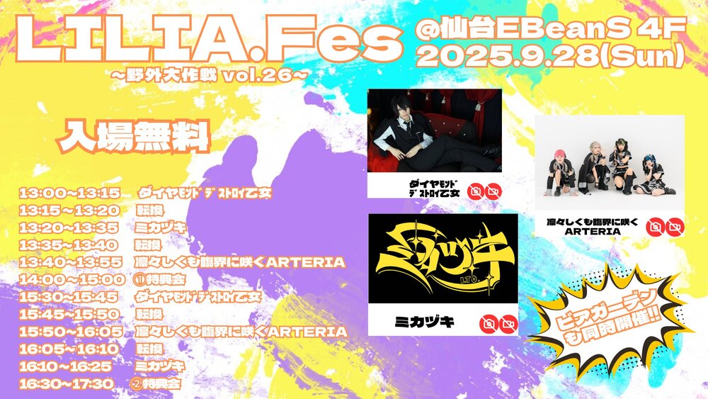 LILIA.Fes 野外大作戦vol.26 SCHEDULE 2025/09/28(日) EBeanS 4階 【9/28 LILIA.Fes vol.26開催!!】 こんにちは✨ LILIA広報です🤗 9月28日(日)は、LILIA.Fes 野外大作戦vol.26を開催します!!✨ 今回は ミカヅキ( @mikazuki_idol )様 にご出演いただきますのでぜひお越しください‼️✨ EBeanS 4階でお待ちしております! ⚠️注意事項⚠️ お客様による、リフト、サークル、モッシュ、ダイブ等は禁止とさせていただきます。 URLをコピーする 報告する