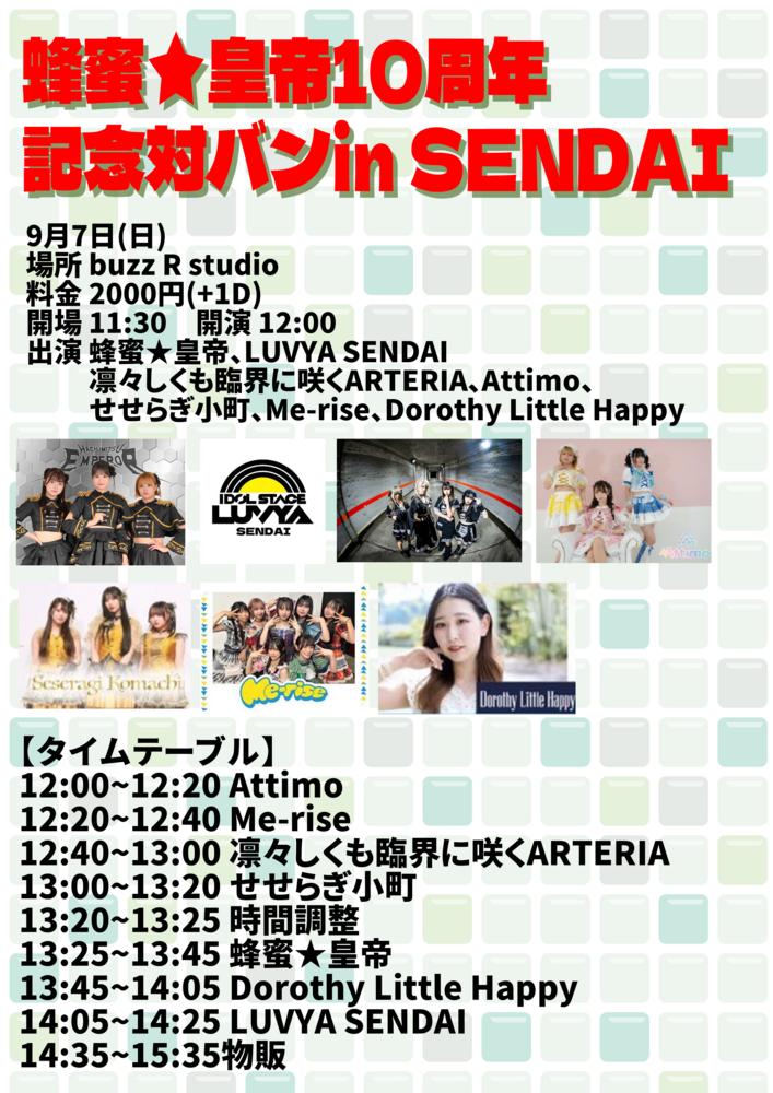 蜂蜜★皇帝10周年 記念対バンinSENDAI SCHEDULE 2025/09/07(日) buzz R studio(バズルスタジオ) 【ARTERIA Live 情報】 蜂蜜★皇帝10周年 記念対バンinSENDAI ■日程 2025年9月7日(日) ■会場 buzz R studio(バズルスタジオ) ■時間 OPEN 11:30 / START 12:00 ■料金 2,000円(+1D) ※チケット予約は必要御座いません。 URLをコピーする 報告する