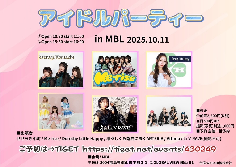 アイドルパーティー in MBL 2025 10 11 SCHEDULE 2025/10/11(土) 郡山MBL 【ARTERIA Live 情報】 アイドルパーティー in MBL 2025 10 11 ■日程 2025年10月11日(土) ■会場 郡山MBL ■時間 ①OPEN 10:30 / START 11:00 ②OPEN 15:30 / START 16:00 ■料金 各部前売2,500円(D別) 通し4,500円(2D別) 当日500円UP チケット https://tiget.net/events/430249 TIGET URLをコピーする 報告する