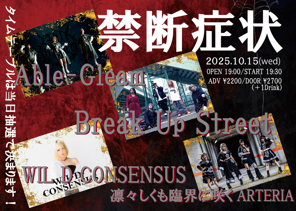 禁断症状 SCHEDULE 2025/10/15(水) Neo Brotherz 【#アルテリアライブ情報】 禁断症状 ■日程 2025年10月15日(水) ■会場 Neo Brotherz ■時間 OPEN 19:00 / START 19:30 ■料金 前売:2,200円/当日:2,700円 (+1D) チケット https://tiget.net/events/431804/ TIGET URLをコピーする 報告する