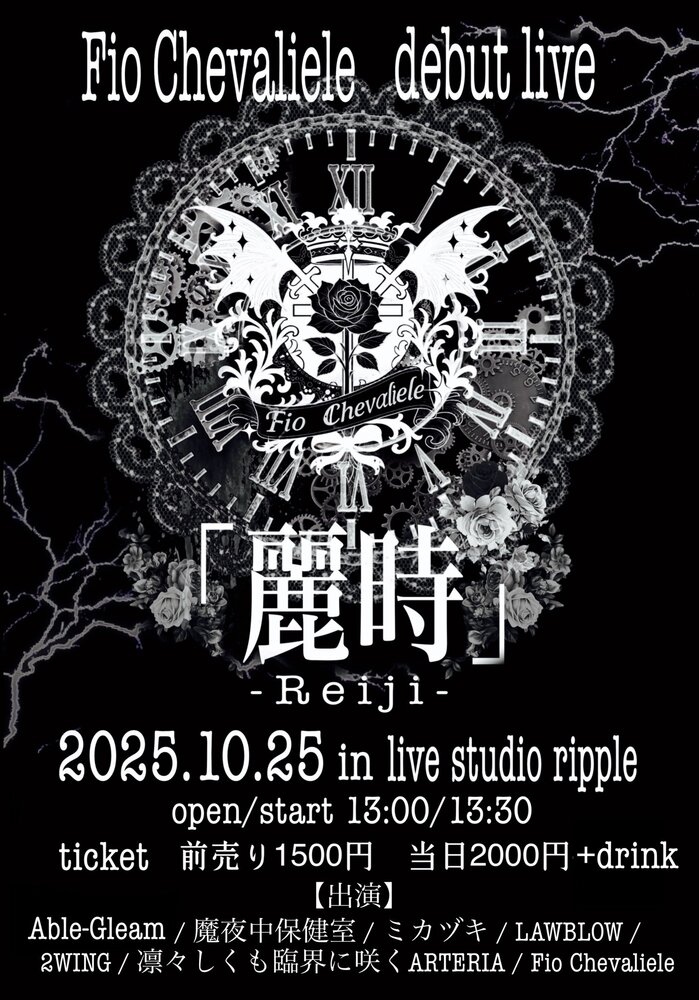Fio Chevaliele debut live 「麗時」 SCHEDULE 2025/10/25(土) live studio ripple 【#アルテリアライブ情報】 Fio Chevaliele debut live 「麗時」 ■日程 2025年10月25日(土) ■会場 live studio ripple ■時間 OPEN13:00 ・START13:30 ■料金 予約:1,500円(+1DRINK別)当日:2,000円(+1DRINK別) https://tiget.net/events/43351 TIGET URLをコピーする 報告する
