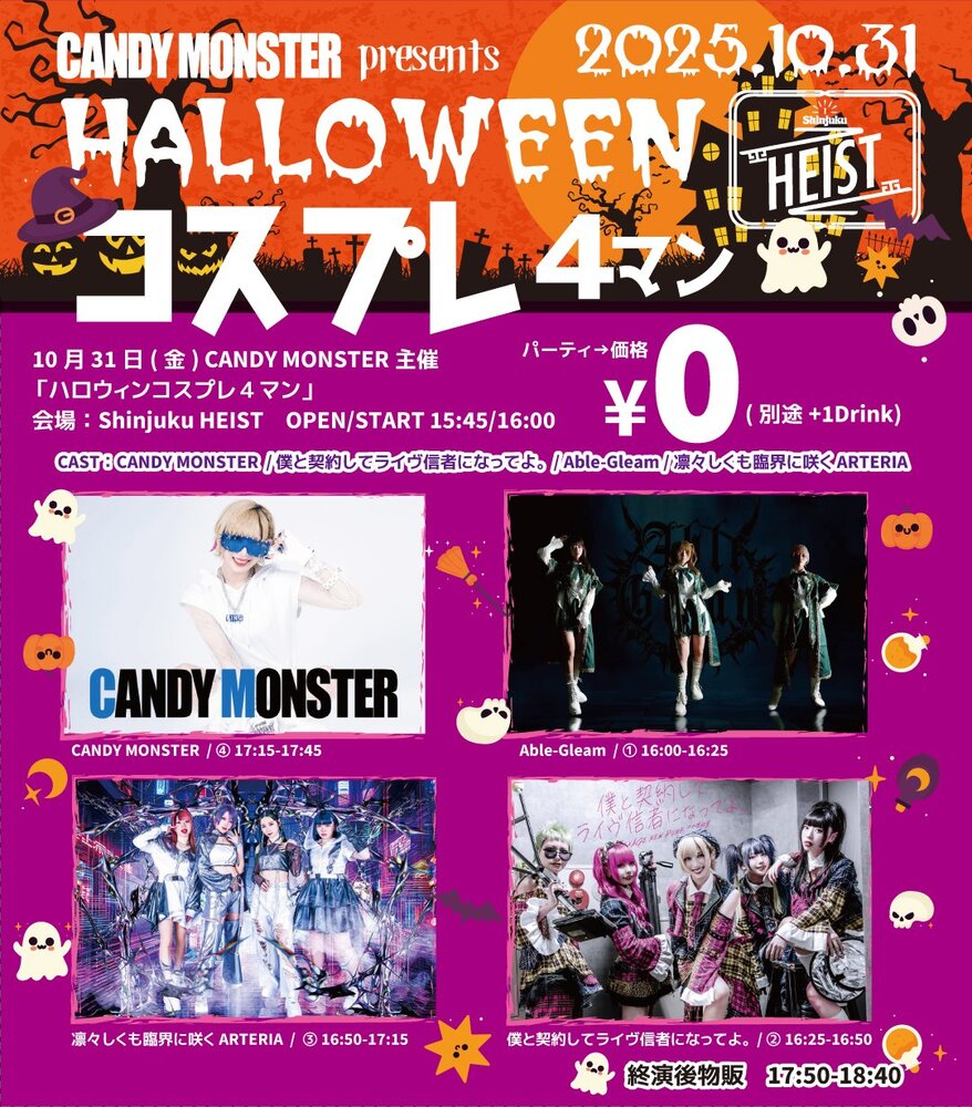 CANDY MONSTERさん主催 「ハロウィンコスプレ4マン」 SCHEDULE 2025/10/31(金) Shinjuku HEIST 【#アルテリアライブ情報】 CANDY MONSTERさん主催 「ハロウィンコスプレ4マン」 ■日程 2025年10月31日(金) ■会場 Shinjuku HEIST ■時間 OPEN 15:45 / START 16:00 ■料金 【パーティ→価格¥0(+1D)】 チケット https://tiget.net/events/435412 TIGET URLをコピーする 報告する